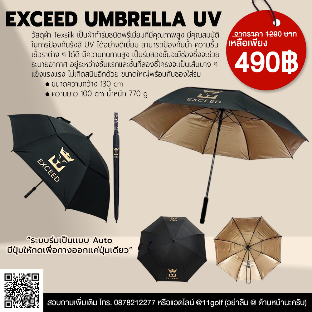 ร่มกอล์ฟ EXCEED New Collection ดีไซน์ใหม่จาก Exceed โดดเด่น ใช้ได้ในสนามกลอ์ฟ หรือทำงาน ดีไซน์ความสวยงาม ยังพร้อมด้วยเทคโนโลยี Black Coating ฉาบภายในสีดำ มีคุณสมบัติในการป้องกันรังสี UVA UVB ได้อย่างดีเยี่ยม ได้เทียบเท่ากับครีมกันแดดที่มี SPF 80++